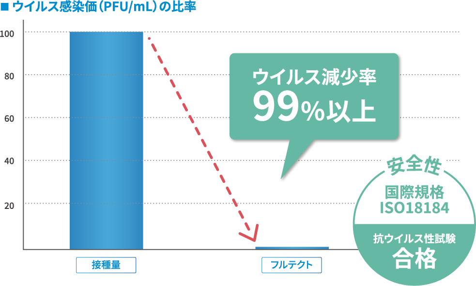 繊維に付着したウイルスの働きを抑制する効果に優れ、ウイルス感染価試験では検出限界以下に低下し、